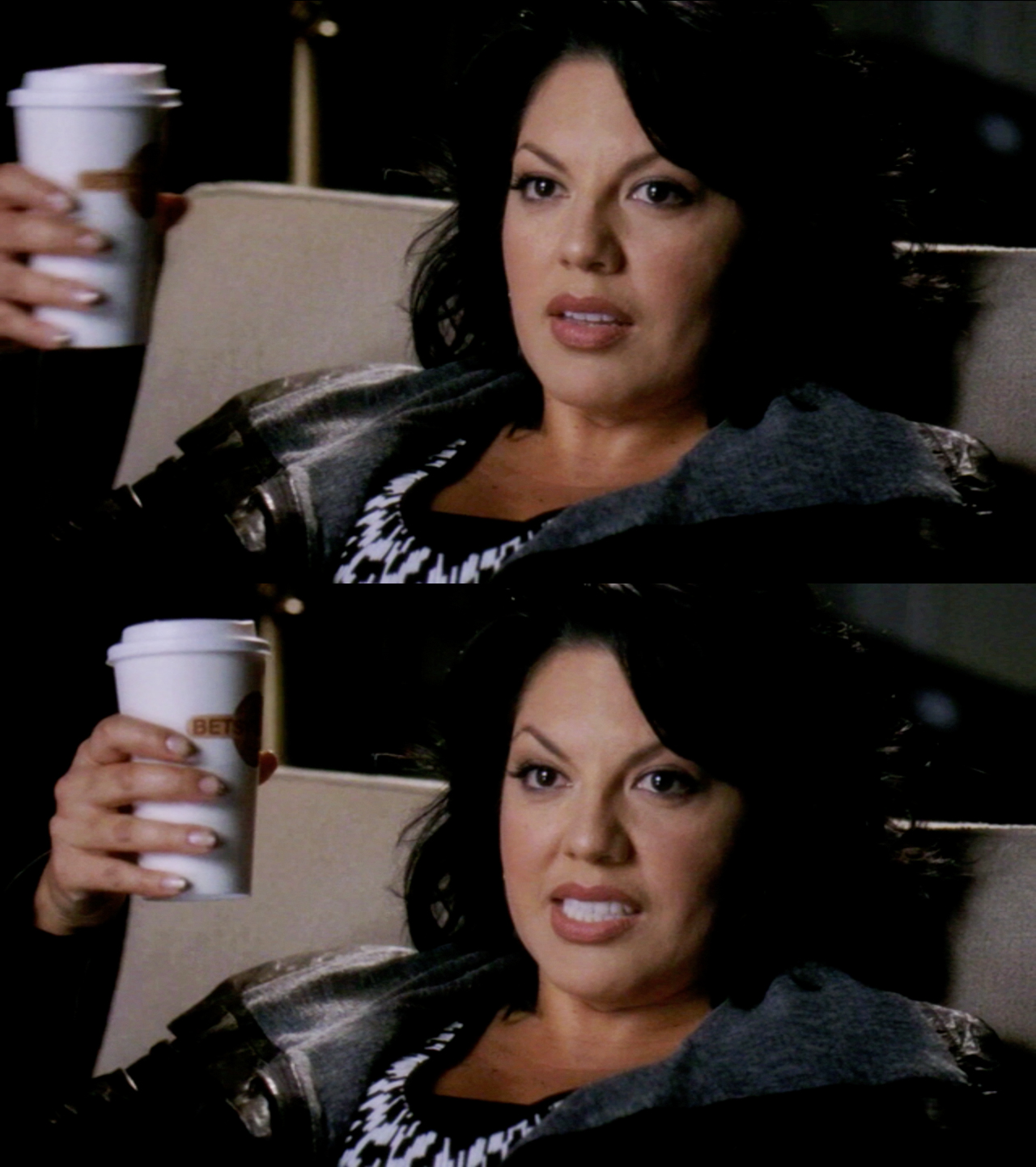 Yeah, not happening. Callie wants her coffee.Arizona asks Callie if she wants her baby to come out underweight with an arm growing out of its forehead.